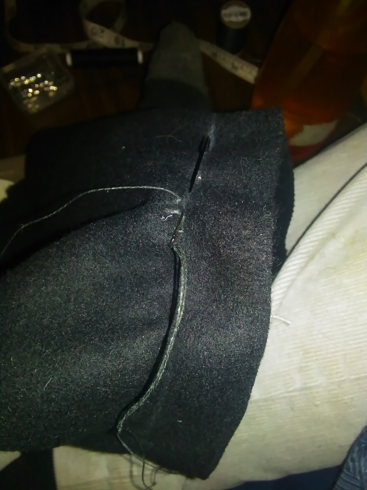 Now for a fun part; here, you can see the piecing in the fabric for the brim--like the upper, it was sewn with a running stitch and occasional backstitches. This is the best photo I have of the process of rantering the seam--an 18th century technique used to hide joins in woolen fabrics. To the best of my knowledge, it is not a seam seen in the 16th century--I chose to use it purely to hide the piecing.